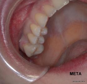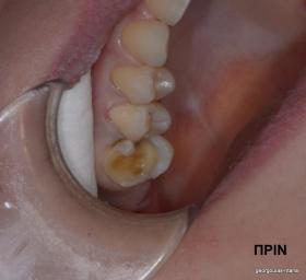 Η ασθενής είχε μια παλιά εκτεταμένη έμφραξη αμαλγάματος στον πρώτο άνω δεξιά γομφίο η οποία έσπασε. Αφαιρέθηκε όλο το παλιό υλικό κ το δόντι αποκαταστάθηκε με τη συγκόλληση ενός ενθέτου σύνθετης ρητίνης