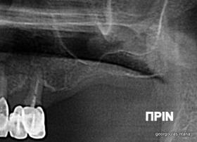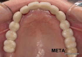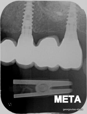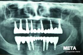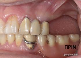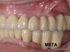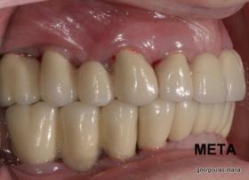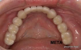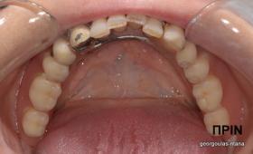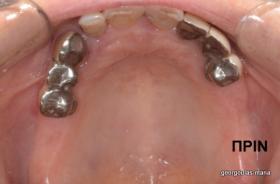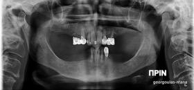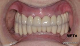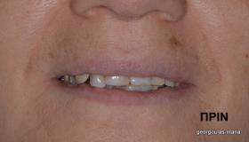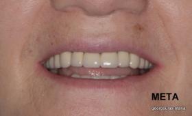 Η ασθενής αυτή είχε παλιές ακίνητες αποκαταστάσεις (γέφυρες) στην άνω γνάθο κ μια κινητή προσθετική αποκατάσταση (μερική οδοντοστοιχία-"μασελάκι") στην κάτω γνάθο. Ήταν δυσαρεστημένη τόσο με την εμφάνιση όσο και με τη λειτουργία των δοντιών της καθώς παραπονιόταν ότι είχαν εντονη κινητικότητα ενώ και οι προσθετικές τους εργασιές δεν ήταν σταθερές. Η πρόγνωση των δοντιών κρίθηκε φτωχή με αποτέλεσμα να μην είναι δυνατή η συμμετοχή τους σε μια νεα προσθετική αποκατάσταση με μακροχρόνια διάρκεια. Η ασθενής επιθυμούσε οι νέες αποκαταστάσεις να είναι σταθερές και ακίνητες. Για το λόγο αυτό αποφασίστηκε η ολική αποκατάσταση της άνω κ κάτω γνάθου με ακίνητες επιεμφυτευματικές εργασίες. Στην αριστερή πλευρά της άνω γνάθου, λόγω μη επαρκούς οστού για την τοποθέτηση εμφυτευμάτων προηγήθηκε επέμβαση ανοιχτής ανύψωσης ιγμορείου άντρου με τη χρήση πιεζοχειρουργικού μηχανήματος ώστε να δημιουργηθεί το κατάλληλο οστικό υπόστρωμα. Ακολούθησε σε επόμενο χειρουργείο η εξαγωγή των υπάρχοντων δοντιών κ η άμεση τοποθέτηση εμφυτεύματων (άμεση εμφύτευση) κ δύο μέρες μετά η τοποθέτηση προσωρινής εργασίας επί των εμφυτευμάτων (άμεση φόρτιση) με αποτέλεσμα η ασθενής να μη μείνει καθόλου χωρίς δόντια κ να είναι καλυμένη αισθητικά όσο καιρό διήρκησε η εργασία