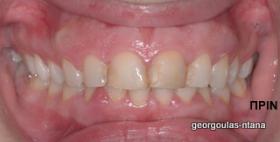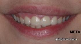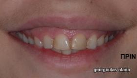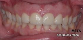 Η ασθενής ήταν δυσαρεστημένη με την αισθητική εμφάνιση των άνω τομέων, οι οποίοι έφεραν εκτεταμένα σφραγίσματα σύνθετης ρητίνης. Οι υπάρχουσες αποκαταστάσεις είχαν αποχρωματιστεί ενώ στα όριά τους λόγω κακής εφαρμογής είχαν προσροφήσει χρωστικές. Αποφασίστηκε η αποκατάσταση των δοντιών με όψεις πορσελάνης που απαιτούν την ελάχιστη δυνατή αφαίρεση οδοντικής ουσίας. Ο δεξιός κεντρικός τομέας, λόγω της ήδη μεγάλης απώλειας οδοντικής ουσίας που παρουσίαζε αποκαταστάθηκε με ολοκεραμικη στεφάνη.