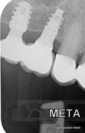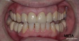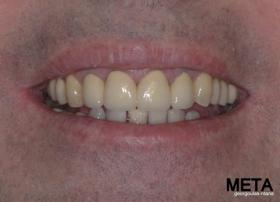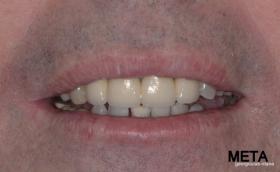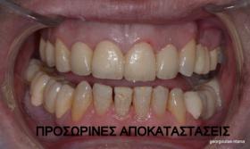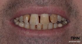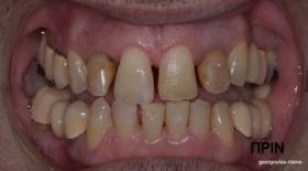 Ο ασθενής προσήλθε στο ιατρείο μας θέλοντας να βελτιώσει την εμφάνιση των πρόσθιων δοντιών του και να αποκαταστήσει την υγεία κ την λειτουργία όλου του στόματος. Πραγματοποιήθηκε περιοδοντική θεραπεία κ ενδοδοντικές θεραπείες (απονευρώσεις) όπου κρίθηκε απαραίτητο και στη συνέχεια τοποθετήθηκαν 3 εμφυτεύματα, 2 δεξιά στις θέσεις του πρώτου κ δεύτερου γομφίου κ 1 αριστερά στη θέση του πρώτου προγομφίου. Κατά την τοποθέτηση των 2 εμφυτευμάτων της δεξιάς πλευράς, πραγματοποιήθηκε κλειστή ανύψωση ιγμορείου με το σύστημα Piezotome-Intralift , τεχνική που εξασφαλίζει τη μικρότερη δυνατή επέμβαση κ τη μικρότερη μετεγχειρητική ταλαιπωρία (minimally invasive), καθώς κ αυξητικους παράγοντες PRF. Σε όλη τη διάρκεια της θεραπείας ο ασθενής ήταν καλυμμένος τόσο αισθητικά όσο και λειτουργικά με προσωρινές μεταβατικές αποκαταστάσεις. 4 μήνες μετά την τοποθέτηση των εμφυτευμάτων κ την οστεοενσωμάτωσή τους, ακολούθησε η τοποθέτηση των μόνιμων αποκαταστάσεων.