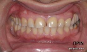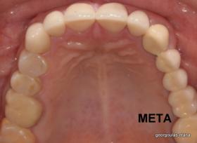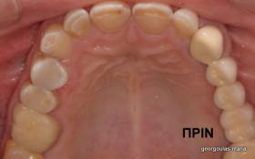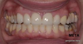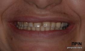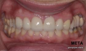 Η ασθενής αυτή είχε διαβρώσεις στα πρόσθια δόντια κ έντονες αποτριβές κυρίως στους κεντρικούς τομείς. Αποφασίστηκε να καλυφθούν τα 5 πρόσθια δόντια (κεντρικοί κ πλάγιοι τομείς δεξιά κ αριστερά κ δεξιός κυνόδοντας) με ολοκεραμικές στεφάνες από διπυριτικό λίθιο (Emax) ώστε να αποκατασταθεί τόσο η αισθητική όσο κ η λειτουργία της ασθενούς. Ο αριστερός κυνόδοντας επειδή αποτελούσε στήριγμα προϋπάρχουσας εργασίας δε συμπεριλήφθηκε στη νέα προσθετική αποκατάσταση.